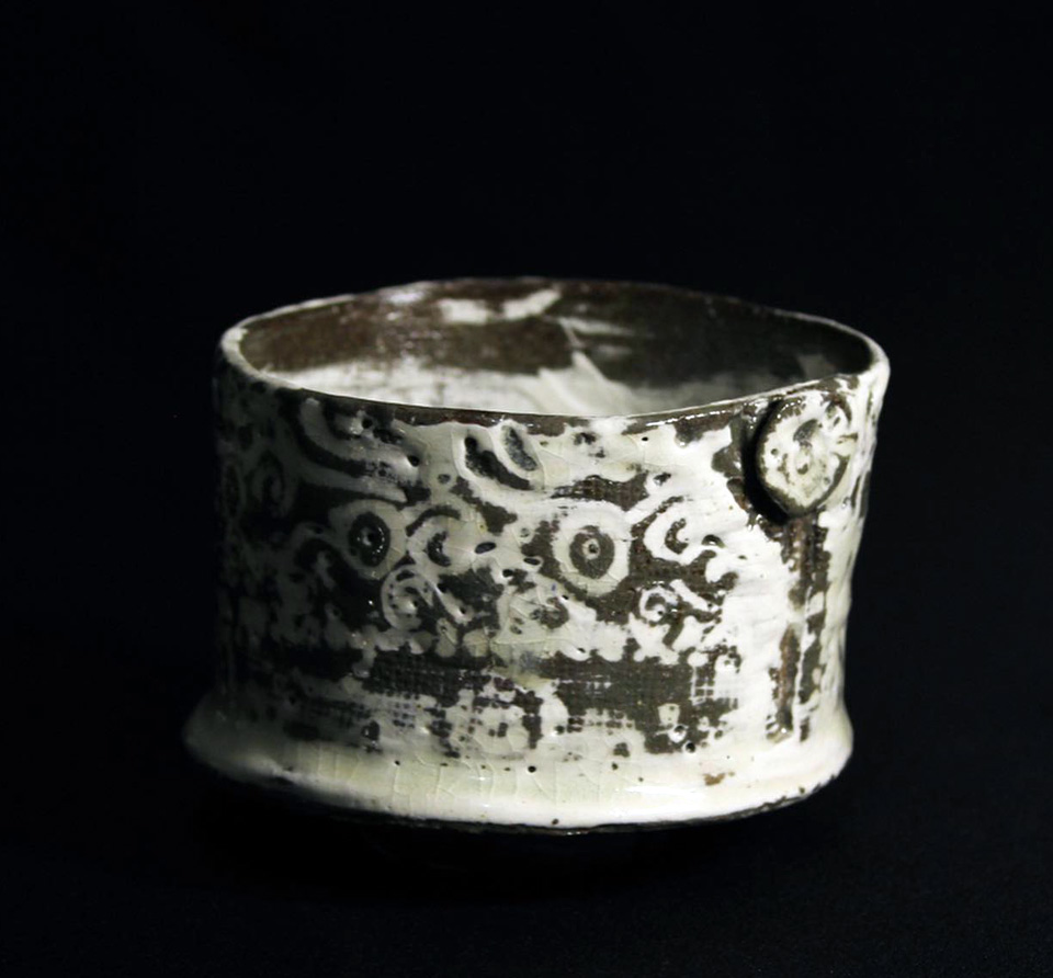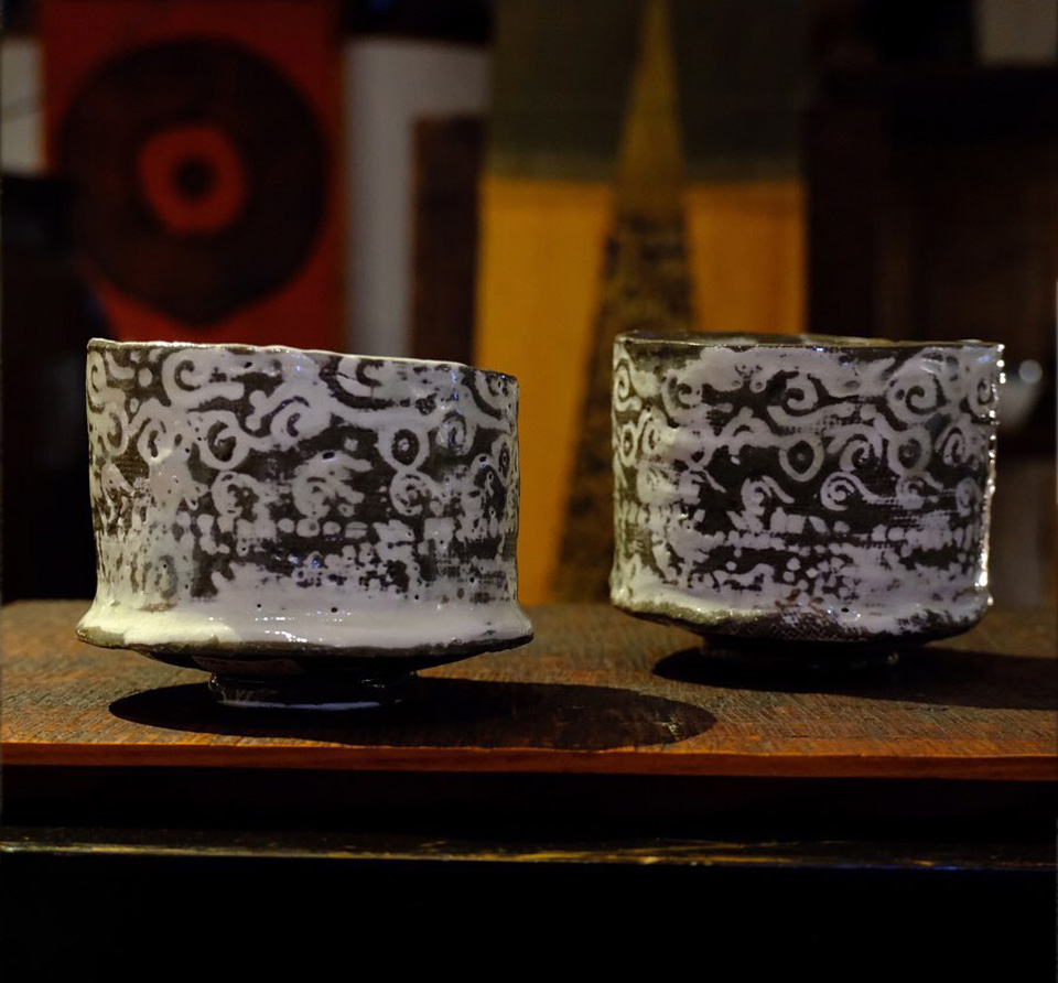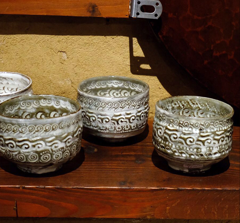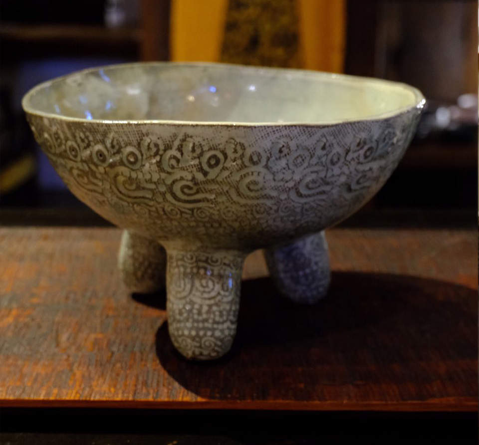 全国から個展の依頼の絶えない彼の作品は、決まったカテゴリに属さない不思議な質感と暖かさ、原始の手触りが手に取る者のハートに化学反応を起こします。 三島紋様を感じさせる独自な印花は、シリーズごとに30種以上の陶印を作成し作陶に臨むそうです。 縄文の祭器にも通じる独特なフォルムと器全体に及ぶ印花は、彼の作陶スタイルの特徴でもあります。