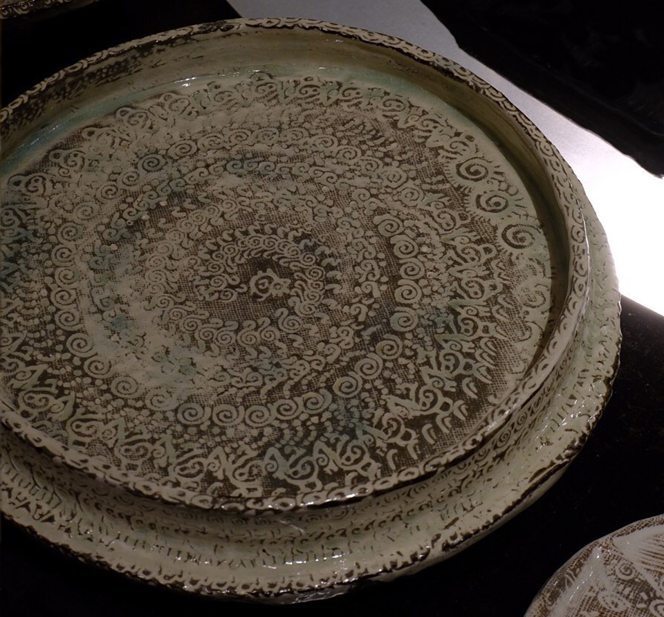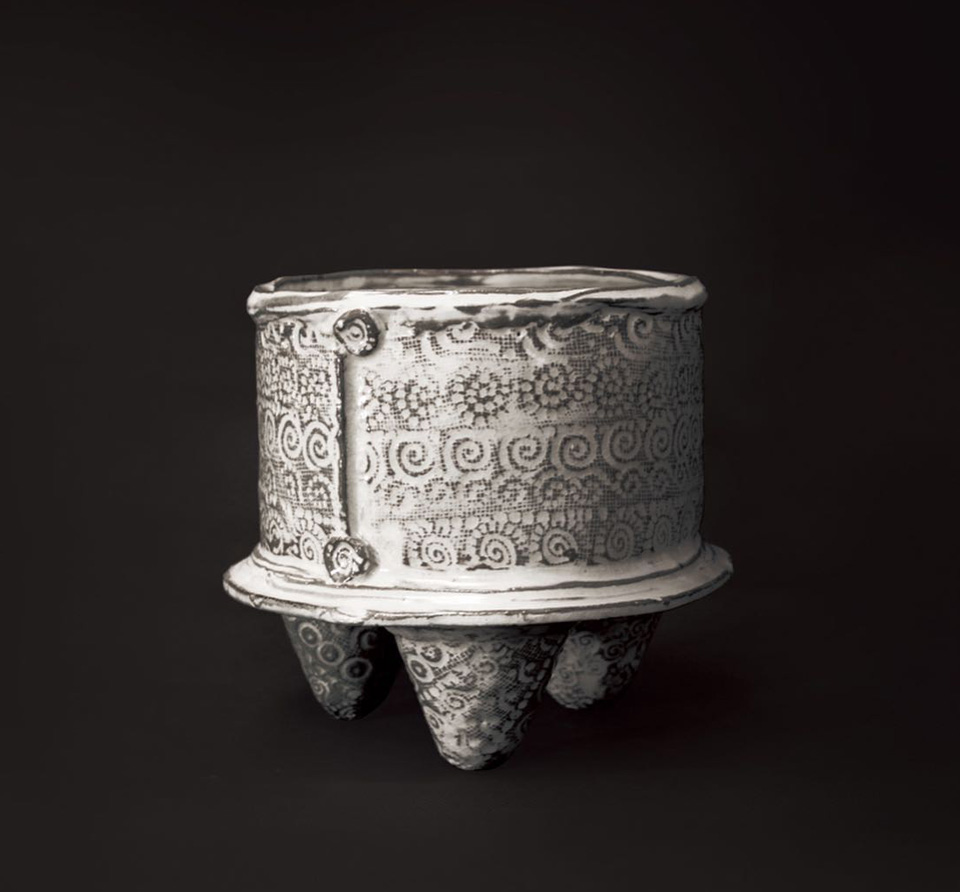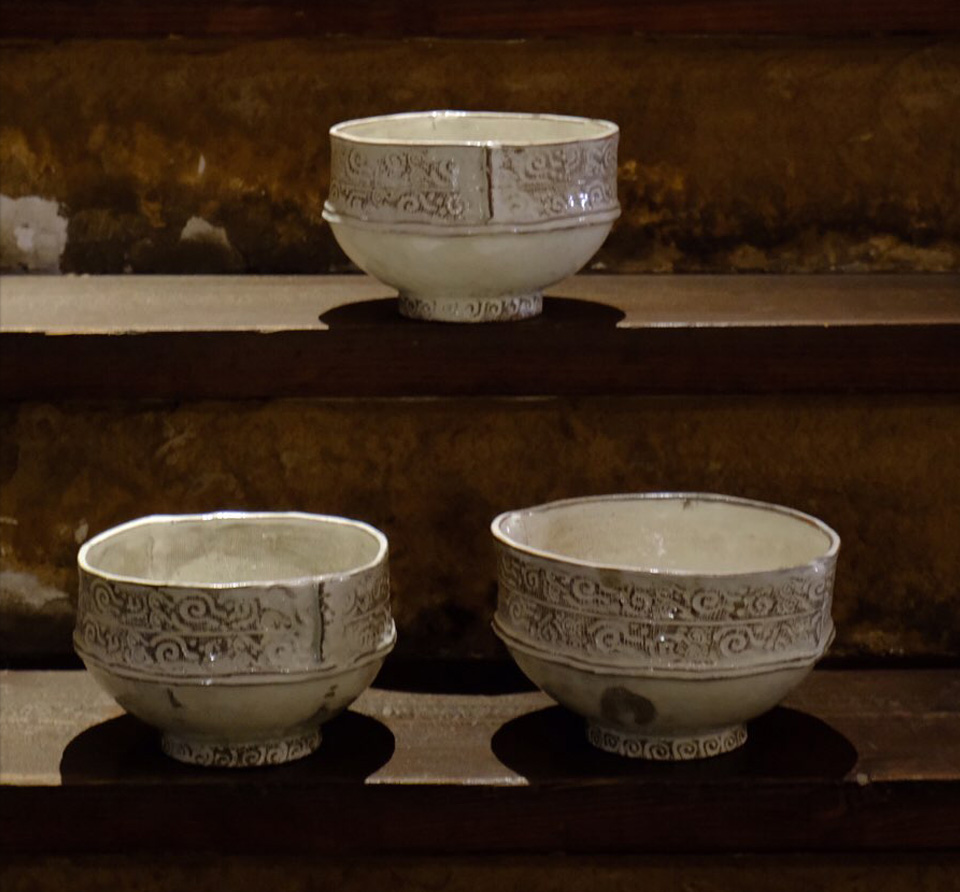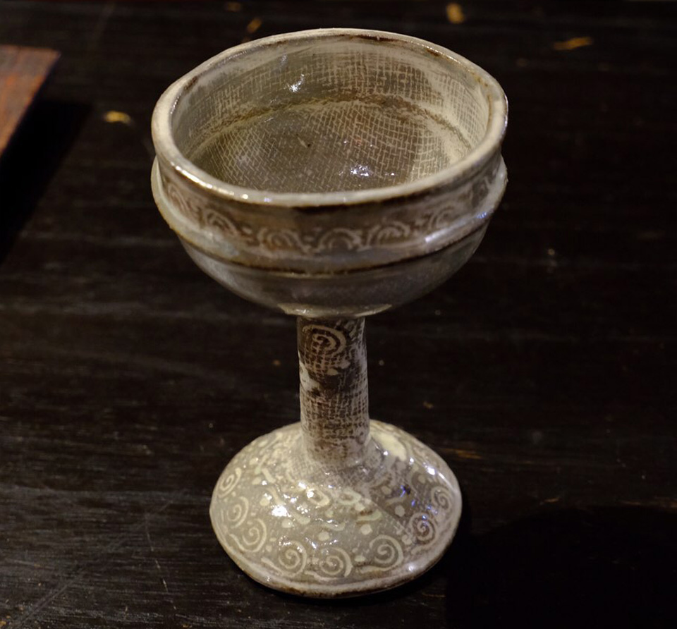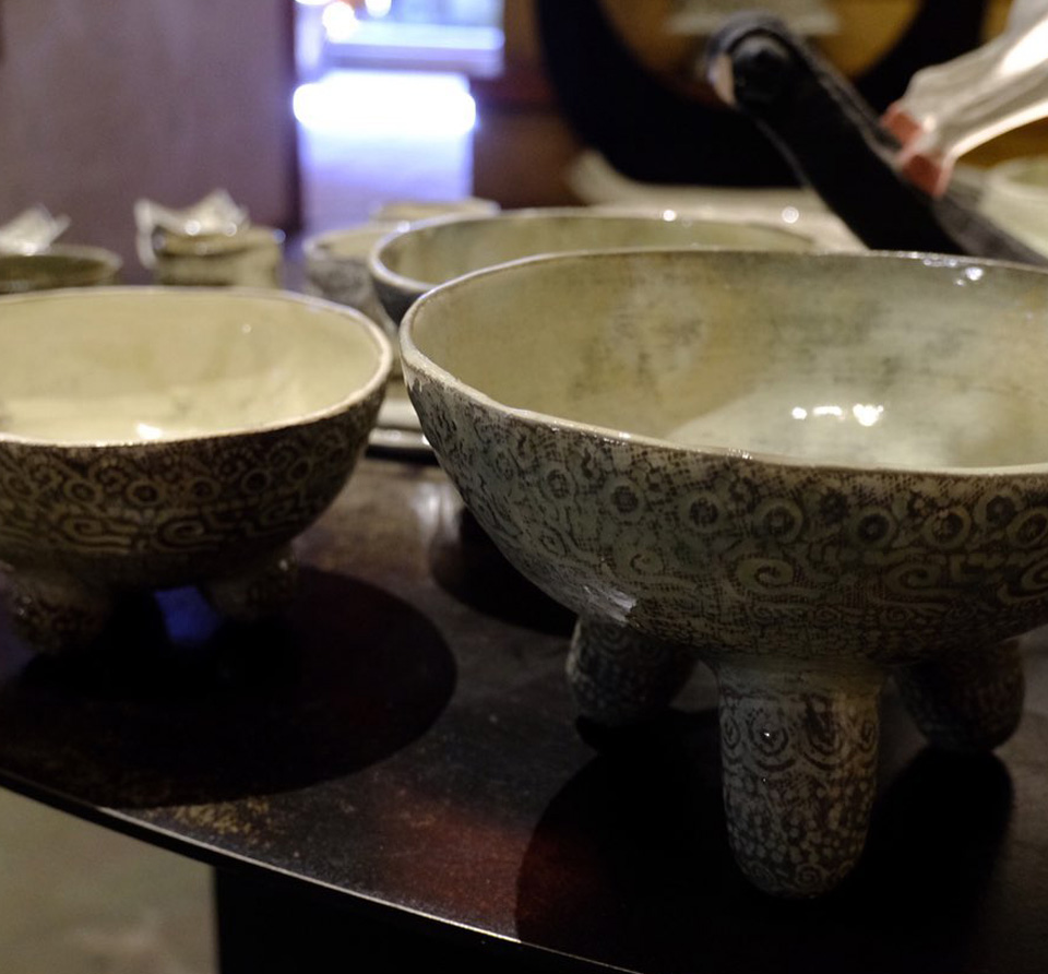 全国から個展の依頼の絶えない彼の作品は、決まったカテゴリに属さない不思議な質感と暖かさ、原始の手触りが手に取る者のハートに化学反応を起こします。 三島紋様を感じさせる独自な印花は、シリーズごとに30種以上の陶印を作成し作陶に臨むそうです。 縄文の祭器にも通じる独特なフォルムと器全体に及ぶ印花は、彼の作陶スタイルの特徴でもあります。